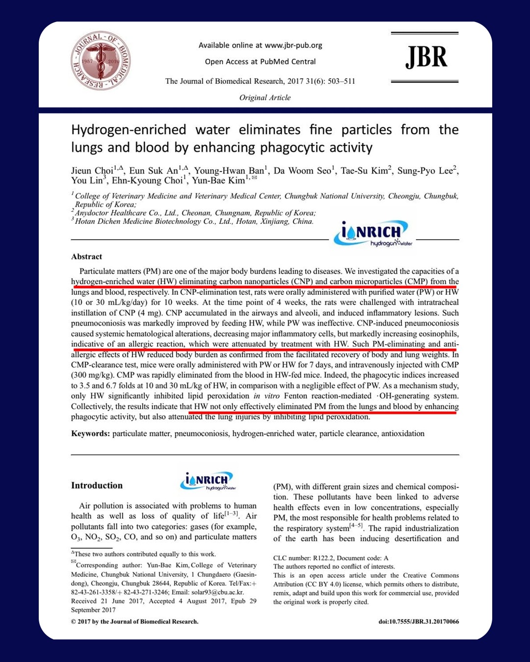“Hydrogen-enriched water eliminates fine particles from the lungs and blood by enhancing phagocytic activity”