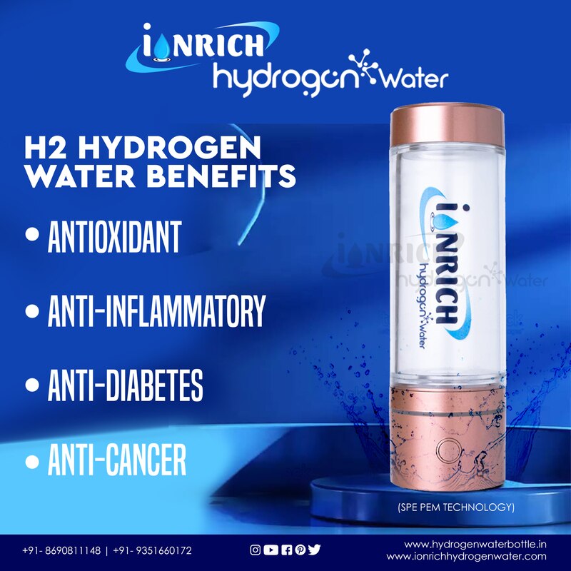 DESCRIPTION OF IONRICH HYDROGEN WATER • Ionrich hydrogen water bottle generates 1500-3000ppb level of hydrogen which is recommended as safe to drink and have therapeutic health benefits. • Ionrich hydrogen water bottle came with Free TDS controlling valve, TDS meter and cleaning solution. • TDS controlling valve is installed in your RO system where you can set TDS level of water between 100-200ppm (as per WHO standards). • TDS play very important role in Hydrogen water. For more information contact us mail us call us and follow us on YouTube, Facebook, and Instagram. IONIZATION TECHNOLOGY: - • SPE/PEM Technology Produces pure Molecular Hydrogen Gas, which is world’s BEST ANTIOXIDANT for YOU. • (SPE PEM TECHNOLOGY) - DUPONT Proton Exchange Membrane - This HYDROGEN WATER BOTTLE comes with state-of-the-art technology based on Solid Polymer Electrolysis /SPE/ and uses PEM ionic membrane for maximum hydrogen retention. Getting rid of chlorine and ozone residue, you'll be left only with hydrogen rich water. We use premium non-toxic Platinum coated Titanium electrode plates, which doesn't leach toxic nickel, molybdenum, or chromium into the water like ionizers. • Molecular hydrogen is a NOVEL ANTIOXIDANT to efficiently reduce oxidative stress and improvement of mitochondrial diseases. ELECTROLYSIS PLATE: - • Ti Titanium medical grade Plate ASTM Eli with 99.9% platinum coating. (Patented sintering technology with IONRICH HYDROGEN WATER) SECRET OF WATER TDS (Total dissolve solids or mineral levels) LEVEL • It is very important to keep in mind the fact that the TDS level of your water (Total dissolve solids or mineral levels) plays an important part in determining the pH level of the water. • Based on our research and the testing of nearly 50000 samples of RO water at each and every home of our customers, we have found that the TDS level of RO water is much less than 50ppm, which has resulted in an acidic pH level, i.e. 2.5 pH to 5.5 pH level, which is causing the RO water to have an acidic pH level. • This is why we must first correct the TDS level of water, which is 100 ppm to 200 ppm as per WHO standards. Once the TDS level of water has been reset to 100 ppm it then reverts to the 6.5 ph to 7.5 ph (neutral) range. BUY IONRICH HYDROGEN WATER BOTTLE • SPE/PEM ionization technology. • 100% pure platinum coated plates. • Free Service. • Book now for your health and wellness. Invest in your Health. (GREAT VALUE ENJOYMENT) - Now only INR 1.00 per day can eliminate the risk of diseases in the next three years. This is a very valuable investment. Getting rid of chlorine and ozone residue, you’ll be left only with rich hydrogen water. #WHAT_IS_SPE_PEM_Technology_in_Hydrogen_water_bottle? We can generally refer to the most common systems used to provide best hydrogen rich water through Solid Poly Electrolytic (SPE) - Proton Exchange Membrane (PEM) technology, when learning about generating pure hydrogen H2 infusion technologies. As a result of these methods, hydrogen-rich water can be produced without residual pollutants such as ozone or chlorine, and this is the only method that produces hydrogen-rich water with therapeutic health benefits. There will be a live demonstration of the testing of chlorine levels in two different types of hydrogen water bottles. In one of the bottles, there is a SPE-PEM-Technology-Hydrogen-Water-Bottle, and in the other hand, there is a traditional type of hydrogen water bottle. There are many steps involved in the electrolysis process. These include the generation of hydrogen gas, and the dissolution of the hydrogen gas in water. However, at the same time ozone and chlorine are also generated and mixed with water, which have many side effects (Chlorinated water has side effects on health). As a result of the upgrading of technology, a new technology has been developed whereby membranes are placed between the electrodes on the hydrogen bottle and this prevents the mixing of ozone and chlorine gas into normal hydrogen rich water because of technology upgrading. Therefore, this technology is called SPE-PEM-Hydrogen, which can produce 99.9% pure hydrogen into water, which helps to improve the health of the user. IONRICH SPE PEM TECHNOLOGY HYDROGEN BOTTLE- DUPONT Proton Exchange Membrane - This HYDROGEN WATER BOTTLE comes with state-of-the-art technology based on Solid Polymer Electrolysis /SPE/ and uses PEM ionic membrane for maximum hydrogen retention. Getting rid of chlorine and ozone residue, you'll be left only with hydrogen rich water. We use premium non-toxic Platinum coated Titanium electrode plates, which doesn't leach toxic nickel, molybdenum, or chromium into the water like ionizers. (DUAL MODE SELECTION) - You get top Hydrogen concentrates faster from 5- or 10-minute cycle. (REVOLUTIONIZE YOUR BODY) - Drinking hydrogen water every day brings many benefits. With regular use, purified HYDROGEN WATER will simply reset your metabolism, helping prevent bad cholesterol and slowing down the aging process. Rich in antioxidants, it helps improve sleep quality, fight off inflammation and improves your skin's health in a natural manner. (RISK FREE) - 1 YEAR - Every Bottle comes with full warranty, and we have friendly customer service - We Have ALL SPARE PARTS for your peace of mind. Product name: IONRICH High-generation hydrogen-rich water Cup Capacity: 215ml Net weight: 875g Electrode material electronic: titanium platinum alloy Diaphragm diaphragm: platinum coated ion membrane Cup Body material: BPA Glass (Food grade) & aluminum alloy voltage power: 2.2W Working hours: 5 mines-10 mines Hydrogen concentration Hydrogen content: 3000ppb+ Battery type battery type: polymer lithium battery Battery capacity Battery capacity: 2800mAh Voltage voltage: 5V-1A
