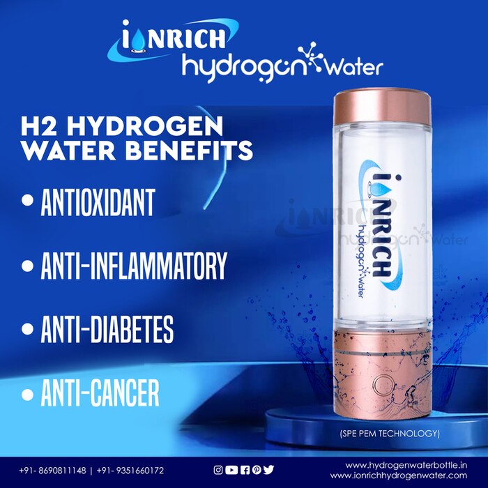 IONRICH SPE-PEM HYDROGEN WATER BOTTLE (99.96% PURE H2-THERAPAUTIC HEALTH BENEFITS) We can generally refer to the most common systems used to provide best hydrogen rich water through Solid Poly Electrolytic (SPE) - Proton Exchange Membrane (PEM) technology, when learning about to generate pure hydrogen H2 infusion technologies. As a result of these methods, hydrogen-rich water can be produced without residual pollutants such as ozone or chlorine, and this is the only method that produces hydrogen-rich water with therapeutic health benefits. There will be a live demonstration of the testing of chlorine levels in two different types of hydrogen water bottles. In one of the bottles, there is a SPE-PEM-Technology-Hydrogen-Water-Bottle, and in the other hand, there is a traditional type of hydrogen water bottle. There are many steps involved in the electrolysis process. These include the generation of hydrogen gas, and the dissolution of the hydrogen gas in water. However, at the same time ozone and chlorine are also generated and mixed with water, which have many side effects (Chlorinated water has side effects on health). As a result of the upgrading of technology, a new technology has been developed whereby membranes are placed between the electrodes on the hydrogen bottle and this prevents the mixing of ozone and chlorine gas into normal hydrogen rich water because of technology upgrading. Therefore, this technology is called SPE-PEM-Hydrogen, which can produce 99.9% pure hydrogen into water, which helps to improve the health of the user. DESCRIPTION OF IONRICH HYDROGEN WATER • Ionrich hydrogen water bottle generates 1500-3000ppb level of hydrogen which is recommended as safe to drink and have therapeutic health benefits. • Ionrich hydrogen water bottle came with Free TDS controlling valve, TDS meter and cleaning solution. • TDS controlling valve is installed in your RO system where you can set TDS level of water between 100-200ppm (as per WHO standards). • TDS play very important role in Hydrogen water. For more information contact us mail us call us and follow us on YouTube, Facebook, and Instagram. IONIZATION TECHNOLOGY: - • SPE/PEM Technology Produces pure Molecular Hydrogen Gas, which is world’s BEST ANTIOXIDANT for YOU. • (SPE PEM TECHNOLOGY) - DUPONT Proton Exchange Membrane - This HYDROGEN WATER BOTTLE comes with state-of-the-art technology based on Solid Polymer Electrolysis /SPE/ and uses PEM ionic membrane for maximum hydrogen retention. Getting rid of chlorine and ozone residue, you'll be left only with hydrogen rich water. We use premium non-toxic Platinum coated Titanium electrode plates, which doesn't leach toxic nickel, molybdenum, or chromium into the water like ionizers. • Molecular hydrogen is a NOVEL ANTIOXIDANT to efficiently reduce oxidative stress and improvement of mitochondrial diseases. ELECTROLYSIS PLATE: - • Ti Titanium medical grade Plate ASTM Eli with 99.9% platinum coating. (Patented sintering technology with IONRICH HYDROGEN WATER) SECRET OF WATER TDS (Total dissolve solids or mineral levels) LEVEL • It is very important to keep in mind the fact that the TDS level of your water (Total dissolve solids or mineral levels) plays an important part in determining the pH level of the water. • Based on our research and the testing of nearly 50000 samples of RO water at each and every home of our customers, we have found that the TDS level of RO water is much less than 50ppm, which has resulted in an acidic pH level, i.e. 2.5 pH to 5.5 pH level, which is causing the RO water to have an acidic pH level. • This is why we must first correct the TDS level of water, which is 100 ppm to 200 ppm as per WHO standards. Once the TDS level of water has been reset to 100 ppm it then reverts to the 6.5 ph to 7.5 ph (neutral) range. BUY IONRICH HYDROGEN WATER BOTTLE • SPE/PEM ionization technology. • 100% pure platinum coated plates. • Free Service. • Book now for your health and wellness. Invest in your Health. (GREAT VALUE ENJOYMENT) - Now only INR 1.00 per day can eliminate the risk of diseases in the next three years. This is a very valuable investment. Getting rid of chlorine and ozone residue, you’ll be left only with rich hydrogen water. #WHAT_IS_SPE_PEM_Technology_in_Hydrogen_water_bottle? We can generally refer to the most common systems used to provide best hydrogen rich water through Solid Poly Electrolytic (SPE) - Proton Exchange Membrane (PEM) technology, when learning about generating pure hydrogen H2 infusion technologies. As a result of these methods, hydrogen-rich water can be produced without residual pollutants such as ozone or chlorine, and this is the only method that produces hydrogen-rich water with therapeutic health benefits. There will be a live demonstration of the testing of chlorine levels in two different types of hydrogen water bottles. In one of the bottles, there is a SPE-PEM-Technology-Hydrogen-Water-Bottle, and in the other hand, there is a traditional type of hydrogen water bottle. There are many steps involved in the electrolysis process. These include the generation of hydrogen gas, and the dissolution of the hydrogen gas in water. However, at the same time ozone and chlorine are also generated and mixed with water, which have many side effects (Chlorinated water has side effects on health). As a result of the upgrading of technology, a new technology has been developed whereby membranes are placed between the electrodes on the hydrogen bottle and this prevents the mixing of ozone and chlorine gas into normal hydrogen rich water because of technology upgrading. Therefore, this technology is called SPE-PEM-Hydrogen, which can produce 99.9% pure hydrogen into water, which helps to improve the health of the user. IONRICH SPE PEM TECHNOLOGY HYDROGEN BOTTLE- DUPONT Proton Exchange Membrane - This HYDROGEN WATER BOTTLE comes with state-of-the-art technology based on Solid Polymer Electrolysis /SPE/ and uses PEM ioni